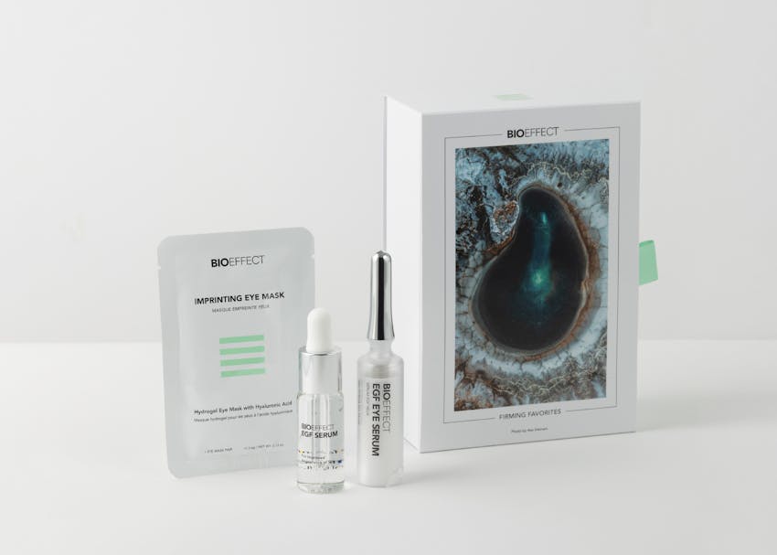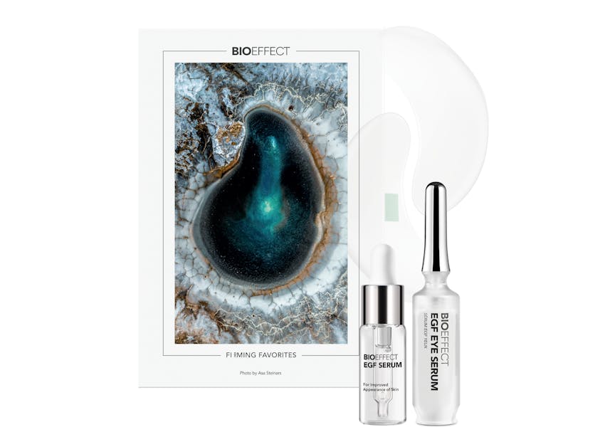 Firming Favorites gjafasettið inniheldur þrjár af okkar mest seldu vörum, sem saman mynda einstaklega árangursríka húðrútínu: EGF Serum (15 ml), EGF Eye Serum (6 ml) og tvö pör af Imprinting Eye Mask. EGF Serum eru margverðlaunaðir húðdropar sem auka raka, draga úr ásýnd fínna lína og hrukka, og þétta húðina. EGF Eye Serum er endurnærandi augnserum sem vinnur á fínum línum, hrukkum, baugum og þrota á augnsvæðinu. Imprinting Eye Mask er róandi og rakagefandi augnmaski, sérstaklega þróaður til að hámarka virkni EGF Eye Serum.