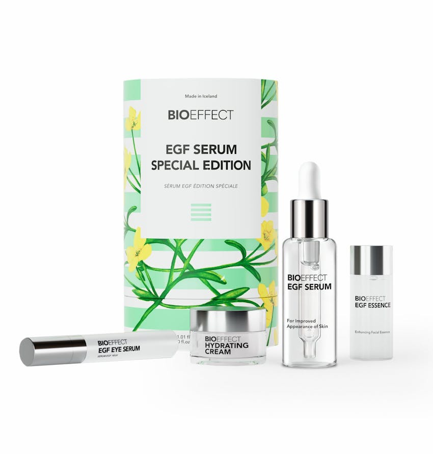 This exclusive set includes the EGF Serum in a new, larger 30 ml size, along with three complimentary deluxe samples of BIOEFFECT bestsellers: EGF Eye Serum (3 ml), EGF Essence (15 ml), and Hydrating Cream (7 ml)—each formulated with age-defying benefits to help prevent and target visible signs of skin aging.